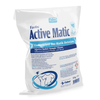 “Fastec Active Matik”, Her tür endüstriyel tip çamaşır makinesinde kullanıma uygun, ağartıcı içeren T.A.E.D. ve enzim katkılı köpüğü ayarlı komple yıkama toz deterjanıdır.