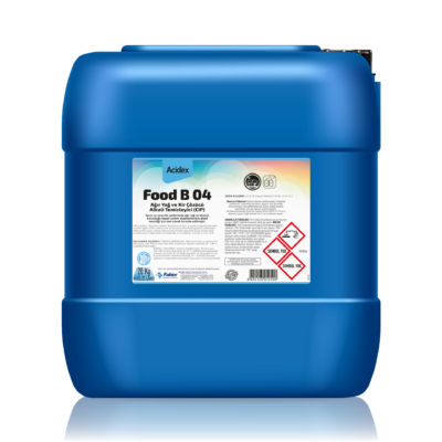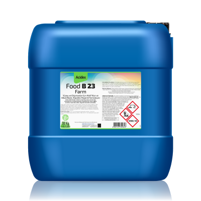 “Acidex Food B 23 Frm”, gıda sektöründe, üretim sırasında veya sonrasında yüzeylerde ve ekipmanlarda oluşabilecek inatçı yağlar ve kirler üzerinde etkili, hijyenik temizlik ürünüdür.